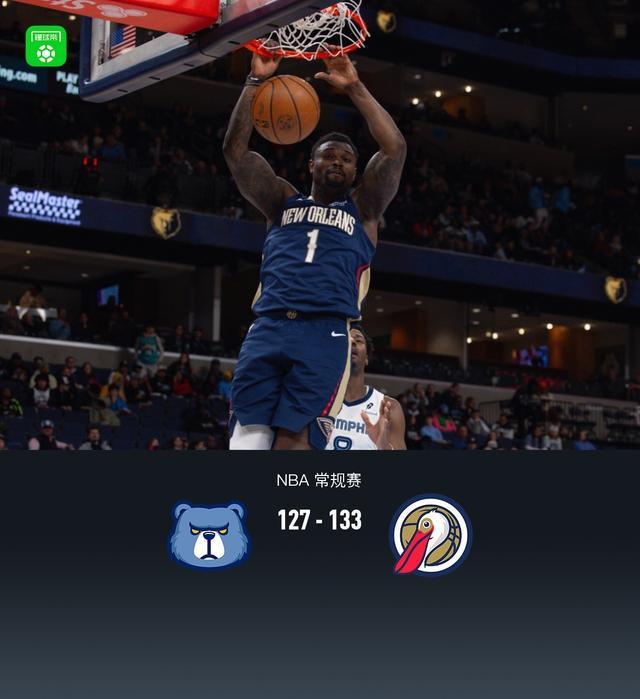 第四节灰熊凯姆-斯宾塞拿下10分,鹈鹕萨迪克-贝拿下19分,最终灰熊127-133不敌鹈鹕